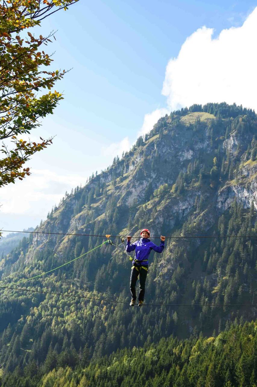 Hoch über Bad Hindelang klettert ihr über Felswände, balanciert über schaukelnde Brücken und saust am Seil über Schluchten .